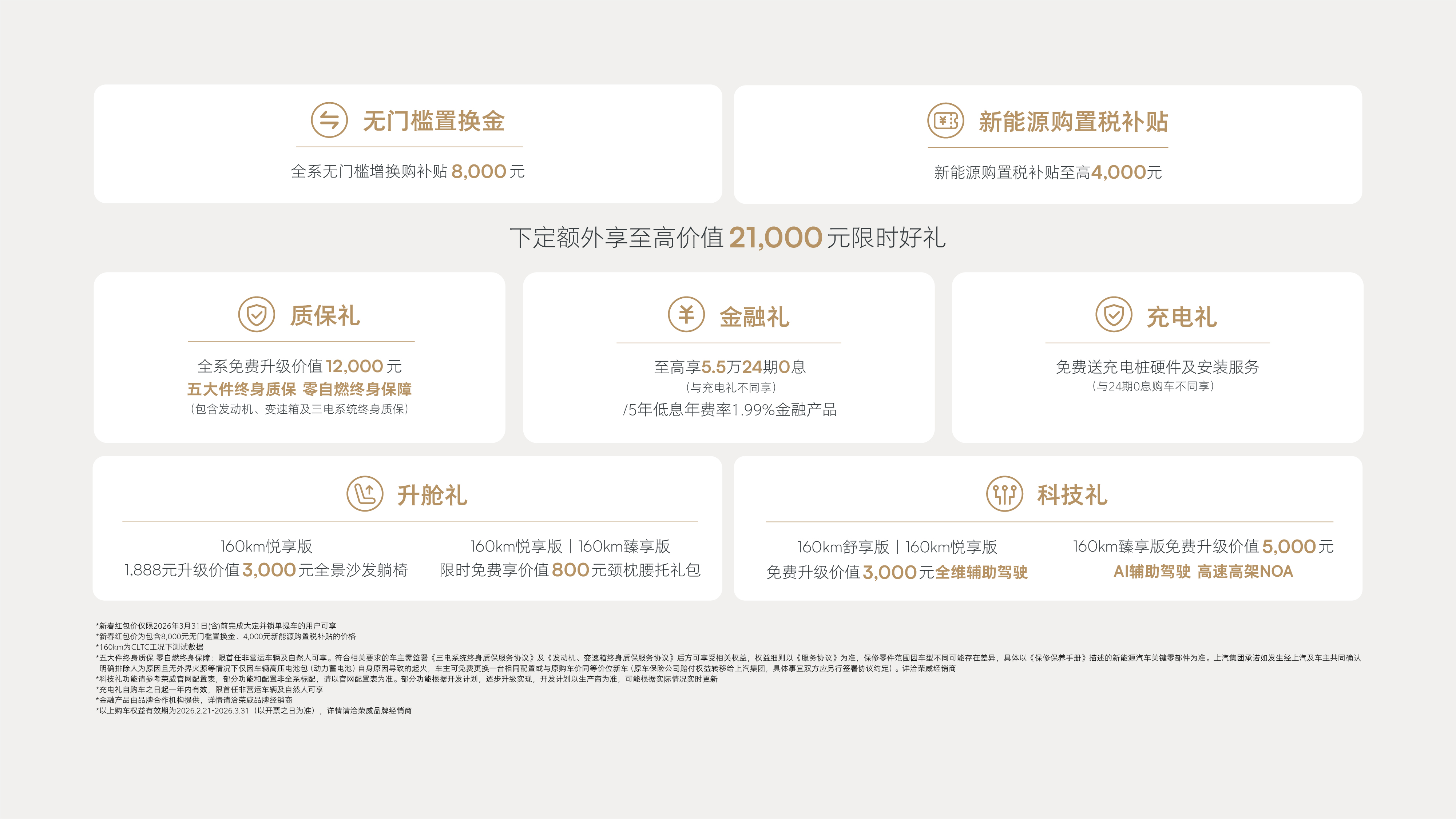 无门槛置换金 全系无门槛增换购补贴8000元 限时双倍膨胀金1000元定金抵 5000元购车款 下定额外享至高价值18000元限时四重礼 质保礼 全系免费升级价值12000元 五大件终身质保 零自燃终身保障(包含发动机、变速箱及三电系统终身质保) 科技礼 160km舒享版| 160km悦享版免费升级价值3000元 全维辅助驾驶 160km臻享版 免费升级价值5000元 AI辅助驾驶 高速高架NOA 升舱礼 160km悦享版1888元升级价值3000元全景沙发躺椅 160km悦享版|160km臻享版 限时免费享价值800元颈枕腰托礼包 金融礼 至高84期超长贷;日供低至14元起更有各类灵活金融产品可供选择限时美好价仅限2025年11月30日(含)前完成大定井锁单提车的用户可享 限时美好价为已包含8000元无门槛置换金及1000元定金抵5000元购车款后的价格 160km为CLTC工况下测试数据 五大件终身质保 零自燃终身保障:限首任非营运车辆及自然人可享。符合相关要求的车主需签署《三电系统终身质保服务协议》及《发动机,变速箱终身质保服务协议》后方可享受相关权益,权益细则以《服务协议》为准,保修零件范围因车型不同可能存在差异,具体以《保修保养手册》描述的新能源汽车关键零部件为准。上汽集团承诺如发生经上汽车主共同确认明确排除 人为原因且无外界火源等情况下仅因车辆高压电池包(动力蓄电池)自身原因导致的起火,车主可免费更换一台相同配置或与原购车价同等价位新车(原车保险公司赔付权益转移给上汽集团,具体事宜双方应另行签署协议约定)。详治荣威经销商 科技礼功能请参考荣威官网配直表,部分功能和配直非全系配置,请以宫网配置表为准。部分功能根据开发计划,逐步升级实现,开发计划以生产商为准,可能根据实际情况实时更新 金融购车方案由融资租赁或第三方金融公司实现,以贷款金融机构最终审批结果为准 预售用户同享上市价格及权益(预售膨账金权益升级为上市限时双倍膨账金权益),限时美好价指包含以上购车权益后销售价格,有效期截止至2025年11月30日(含)