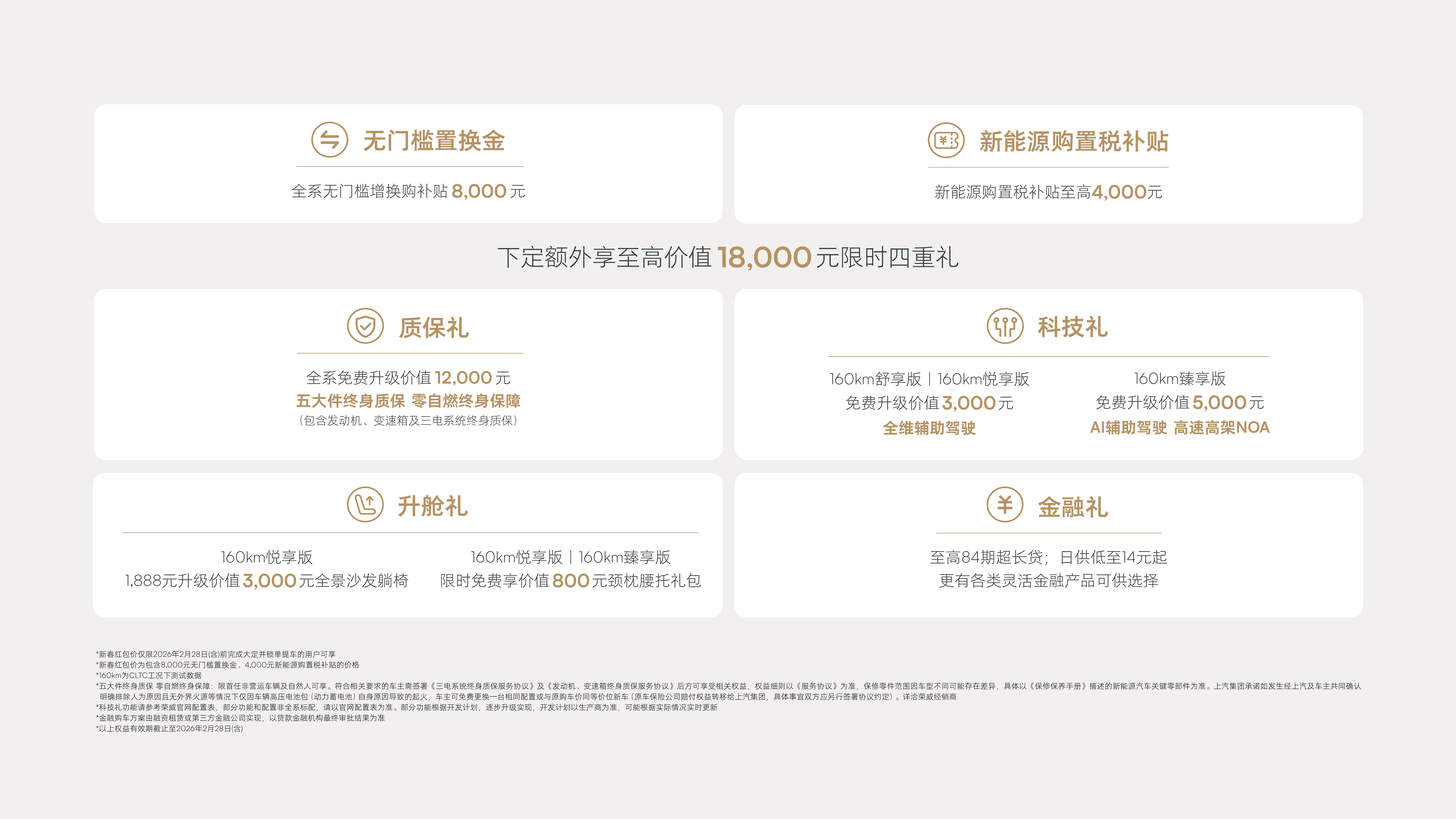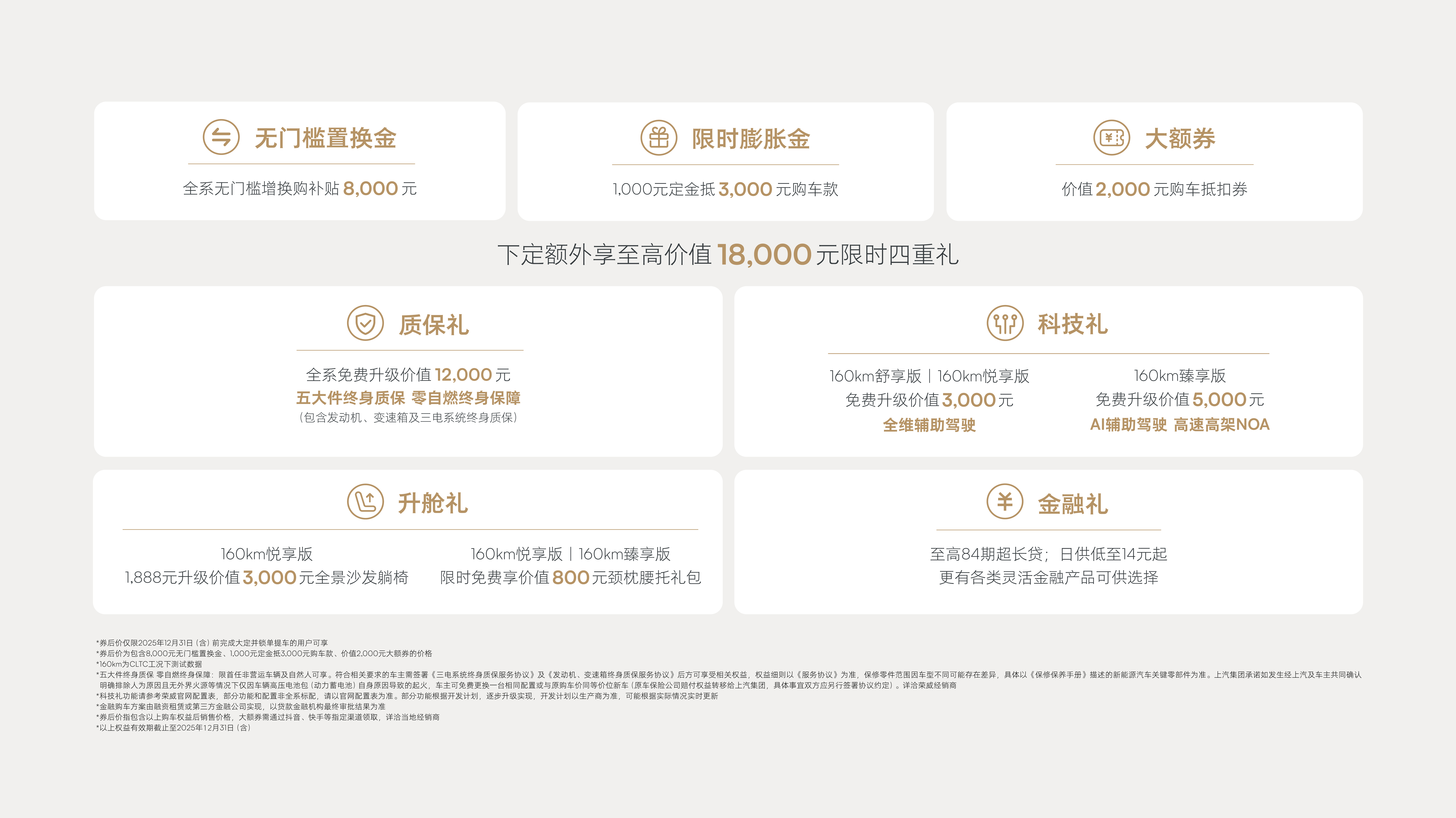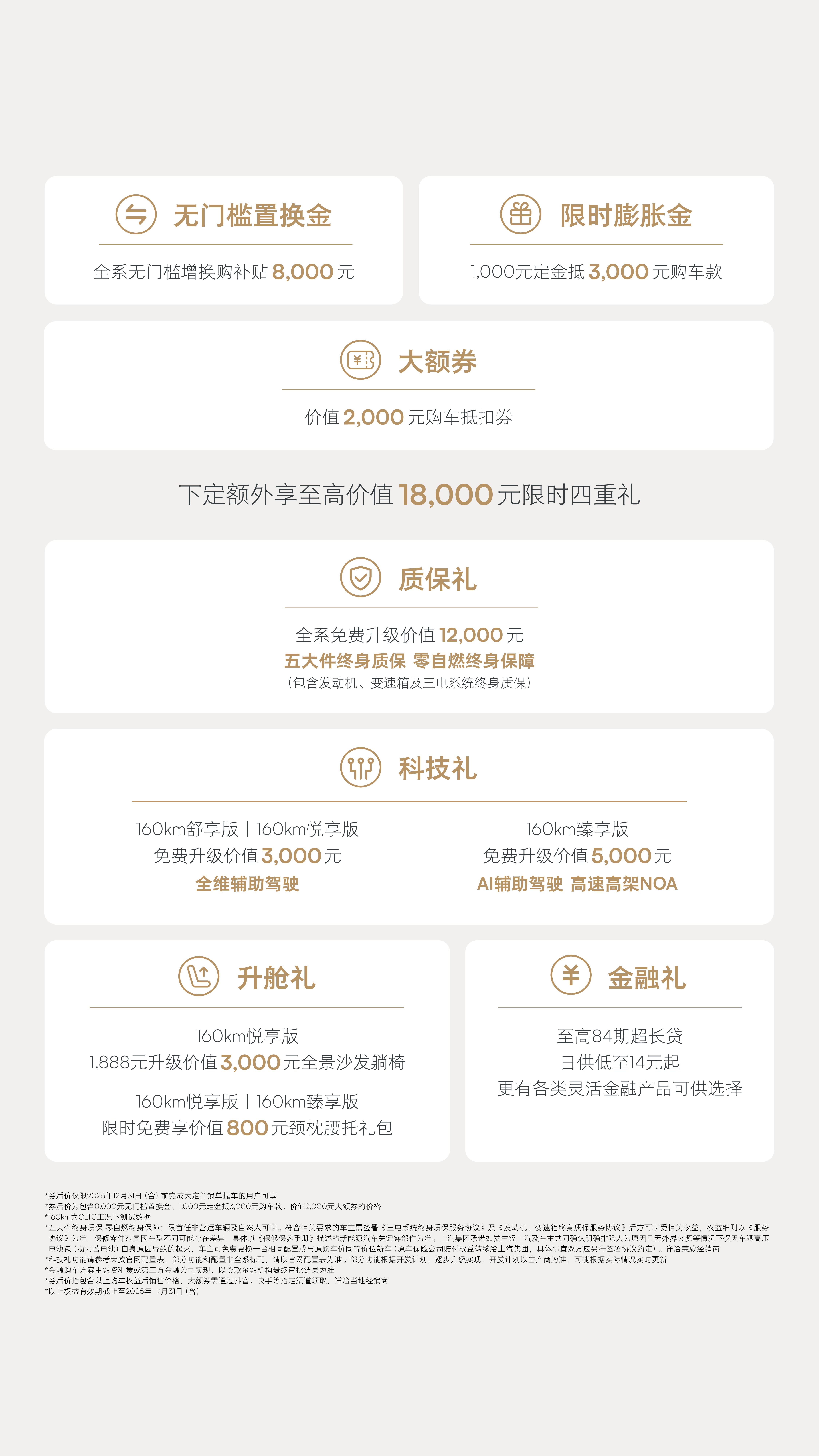 无门槛置换金 全系无门槛增换购补贴8000元 限时双倍膨胀金1000元定金抵 5000元购车款 下定额外享至高价值18000元限时四重礼 质保礼 全系免费升级价值12000元 五大件终身质保 零自燃终身保障(包含发动机、变速箱及三电系统终身质保) 科技礼 160km舒享版| 160km悦享版免费升级价值3000元 全维辅助驾驶 160km臻享版 免费升级价值5000元 AI辅助驾驶 高速高架NOA 升舱礼 160km悦享版1888元升级价值3000元全景沙发躺椅 160km悦享版|160km臻享版 限时免费享价值800元颈枕腰托礼包 金融礼 至高84期超长贷;日供低至14元起更有各类灵活金融产品可供选择限时美好价仅限2025年11月30日(含)前完成大定井锁单提车的用户可享 限时美好价为已包含8000元无门槛置换金及1000元定金抵5000元购车款后的价格 160km为CLTC工况下测试数据 五大件终身质保 零自燃终身保障:限首任非营运车辆及自然人可享。符合相关要求的车主需签署《三电系统终身质保服务协议》及《发动机,变速箱终身质保服务协议》后方可享受相关权益,权益细则以《服务协议》为准,保修零件范围因车型不同可能存在差异,具体以《保修保养手册》描述的新能源汽车关键零部件为准。上汽集团承诺如发生经上汽车主共同确认明确排除 人为原因且无外界火源等情况下仅因车辆高压电池包(动力蓄电池)自身原因导致的起火,车主可免费更换一台相同配置或与原购车价同等价位新车(原车保险公司赔付权益转移给上汽集团,具体事宜双方应另行签署协议约定)。详治荣威经销商 科技礼功能请参考荣威官网配直表,部分功能和配直非全系配置,请以宫网配置表为准。部分功能根据开发计划,逐步升级实现,开发计划以生产商为准,可能根据实际情况实时更新 金融购车方案由融资租赁或第三方金融公司实现,以贷款金融机构最终审批结果为准 预售用户同享上市价格及权益(预售膨账金权益升级为上市限时双倍膨账金权益),限时美好价指包含以上购车权益后销售价格,有效期截止至2025年11月30日(含)